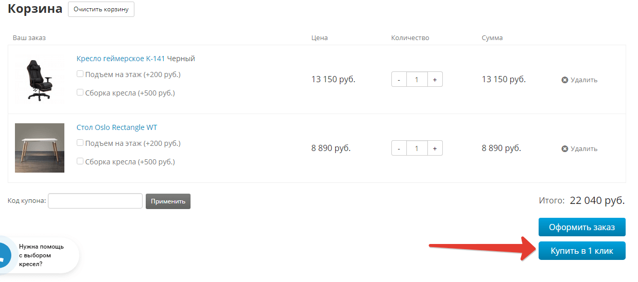 Если вы хотите оформить таким образом несколько разных товаров, то просто добавляйте их в корзину, а затем перейдите в нее и нажмите на кнопку «Купить в 1 клик».