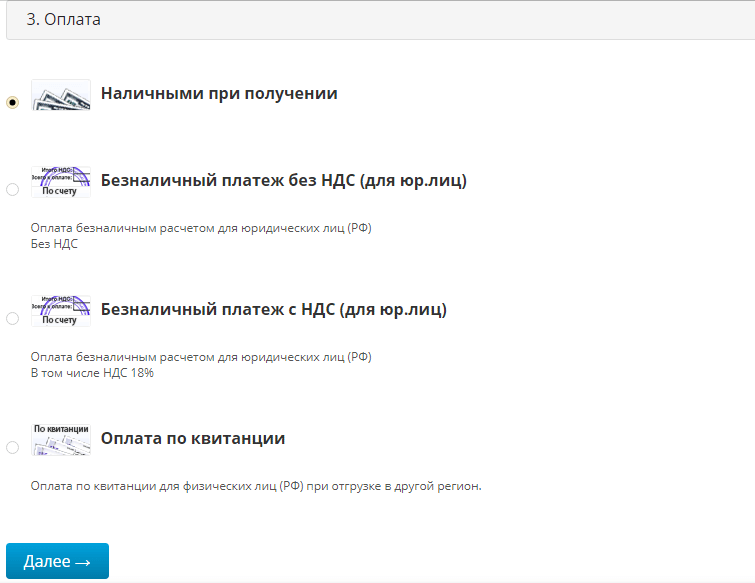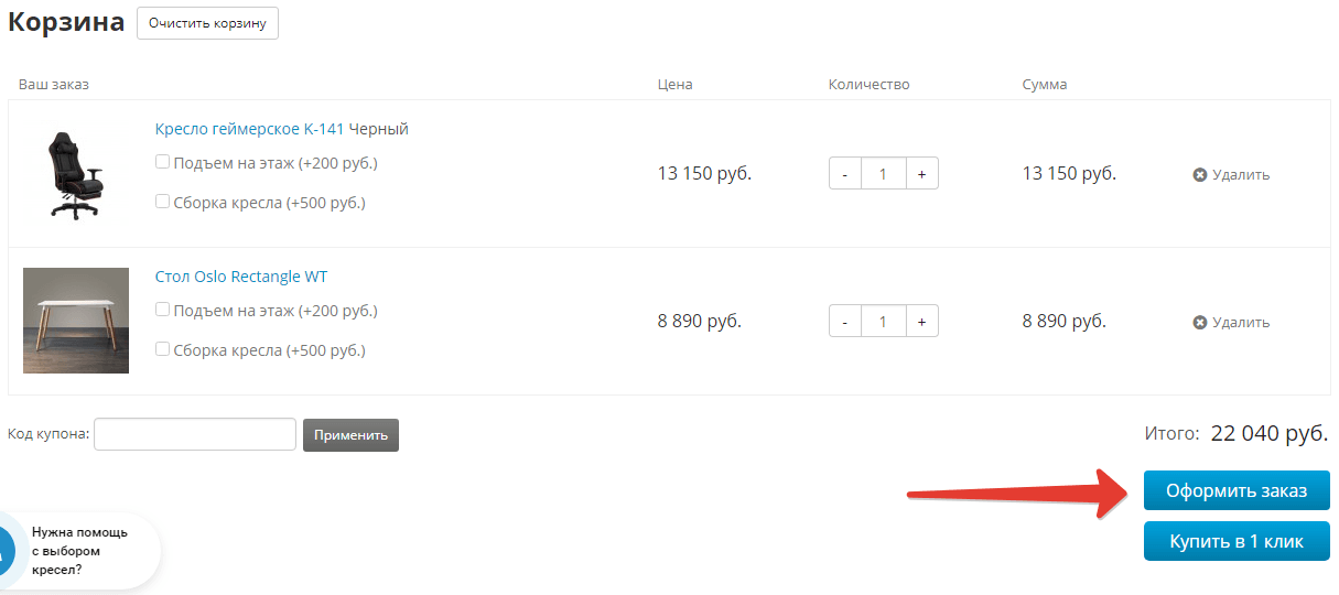 - Оформление заказа через корзину – если для вас важна каждая мелочь и вы хотите подробно описать процесс доставки и оплаты, то используйте стандартный функционал оформления заказа через корзину сайта.